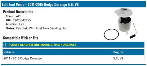 2011 Dodge Durango Fuel Pump. Web dodge durango 2011, rear fuel pump and sender assembly by mopar®. Average failure mileage is 90,550 miles.